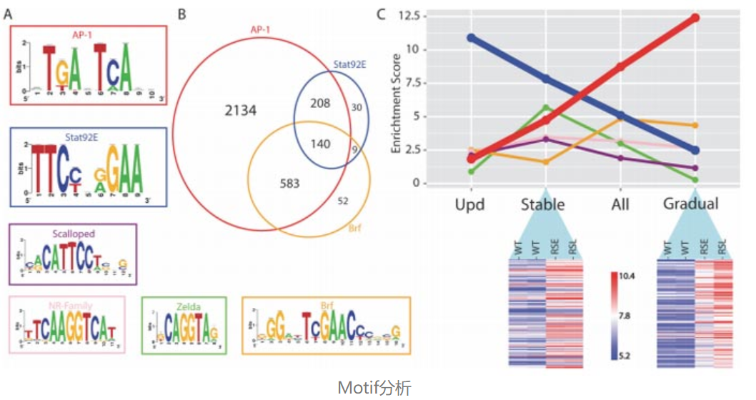 这项技术的关键是依赖带有已知DNA序列的Tn5转座酶复合物,相当于在开放性区域对DNA进行标签插入,再经过对已知DNA序列的PCR扩增,得到不同的DNA片段,建库以及高通量测序分析,即可得到开放染色质信息。测序结果可以用于判断区域的可接近性是否增加,也可以看转录因子结合区域和核小体的位置。另外,测序结果中包含大量的转录起始的Motif信息,这些Motif信息可以在数据库中找到对应的调控转录因子,为下游实验设计提供方向。